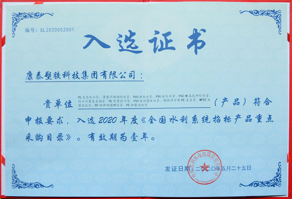 日前,水利部公布了2020年度《全國水利系統(tǒng)招標產(chǎn)品重點采購目錄》入選企業(yè)評審結(jié)果,其中康泰集團的薄壁不銹鋼給水管、PE生態(tài)給水管、PVC-O給水管、PVC-M高抗沖給水管、PVC-U雙壁波紋管、給水襯塑復合鋼管、PVC-U給水管、鋼絲網(wǎng)骨架PE復合管、MPVE?雙壁波紋管、PE實壁排污管、PE鋼帶增強螺旋管、PE雙壁波紋管憑借過硬的產(chǎn)品質(zhì)量入選該名單。