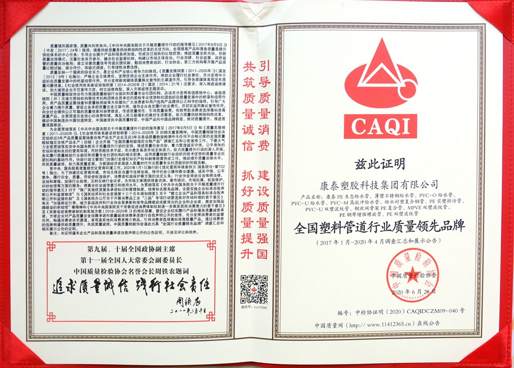 近日,康泰在中國質(zhì)量檢驗(yàn)協(xié)會(huì)主辦主題活動(dòng)中,榮獲“全國質(zhì)量誠信先進(jìn)企業(yè)”稱號(hào),同時(shí)還獲得“全國塑料管道行業(yè)質(zhì)量領(lǐng)先品牌”、“全國質(zhì)量檢驗(yàn)穩(wěn)定合格產(chǎn)品”等榮譽(yù)。