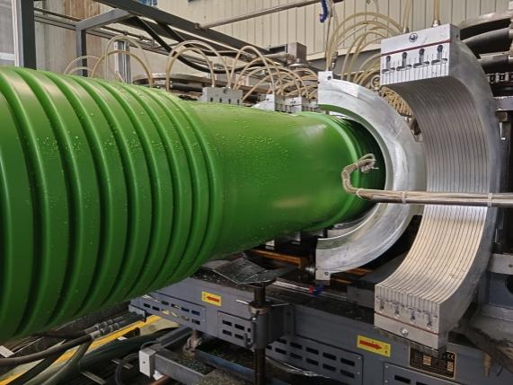 “新型管道彎曲彈性模量 2500—3500MPa,是傳統(tǒng)聚烯烴材料的 2—3倍,加之新型管道采用結(jié)構(gòu)壁‘弓’結(jié)構(gòu),從力學(xué)結(jié)構(gòu)看,獲得同樣環(huán)剛度,是最節(jié)省材料的設(shè)計。新型管道可以減少30%的碳排放?!鄙鲜鲐撠?zé)人說。