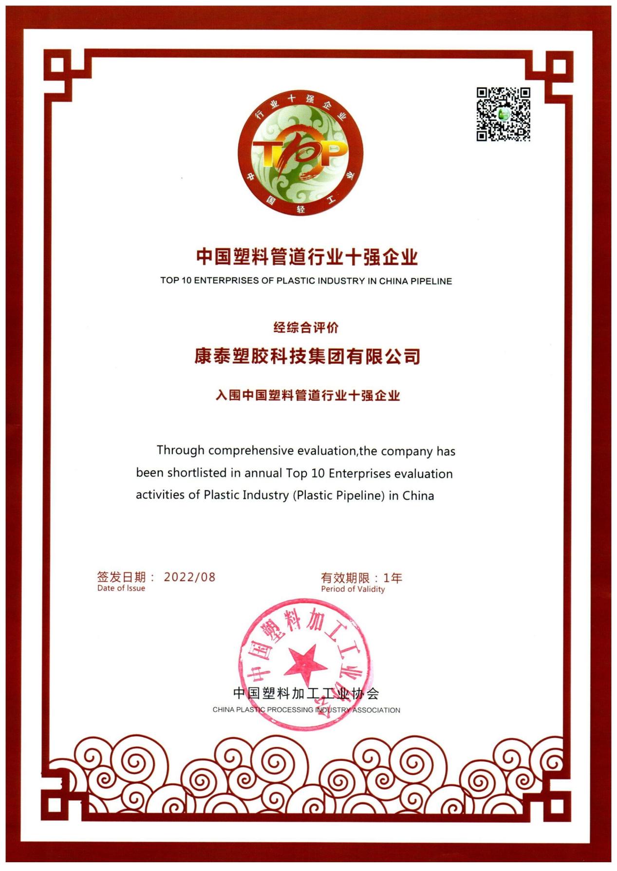 日前,2022年度中國輕工業(yè)塑料管材行業(yè)十強企業(yè)評價結果揭曉,康泰集團連續(xù)七年榮獲“中國輕工業(yè)塑料行業(yè)(塑料管道)十強企業(yè)”稱號。
