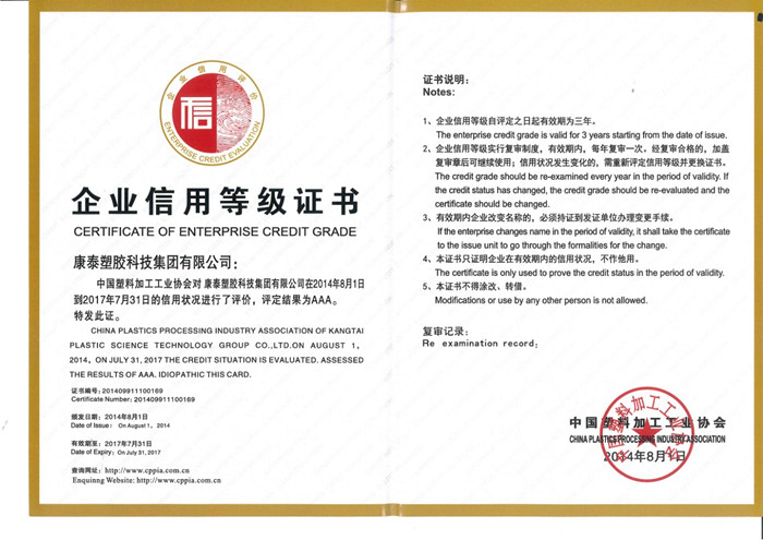 本報(bào)訊 在中國(guó)塑料加工工業(yè)協(xié)會(huì)2014-2017年度企業(yè)信用等級(jí)評(píng)級(jí)活動(dòng)中,經(jīng)中國(guó)塑料加工工業(yè)協(xié)會(huì)審核批準(zhǔn),康泰集團(tuán)在信用狀況進(jìn)行了評(píng)價(jià),獲得了AAA級(jí)榮譽(yù)證書(shū)。公司榮獲此項(xiàng)殊榮,是公司始終堅(jiān)持“立足誠(chéng)信,科學(xué)管理”的經(jīng)營(yíng)理念所取得的成果。