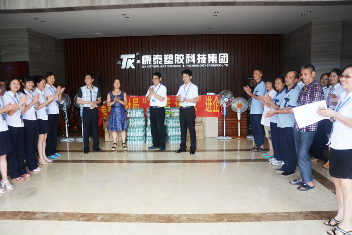 ?????? 8月7日下午,崇州市人力資源和社會保障局副局長、工會主席李茂清帶領(lǐng)局“送清涼”慰問組,來到康泰塑膠科技集團有限公司,工會主席吳彬及人事行政中心呂旭梅經(jīng)理接待了慰問組。人社部門為公司職工送上了電風扇、礦泉水、和防暑物品,并將有關(guān)勞動安全、工資待遇等內(nèi)容的人社政策宣傳資料送到職工手中,使職工進一步了解有關(guān)政策法規(guī),依法主動保護自身合法權(quán)益。