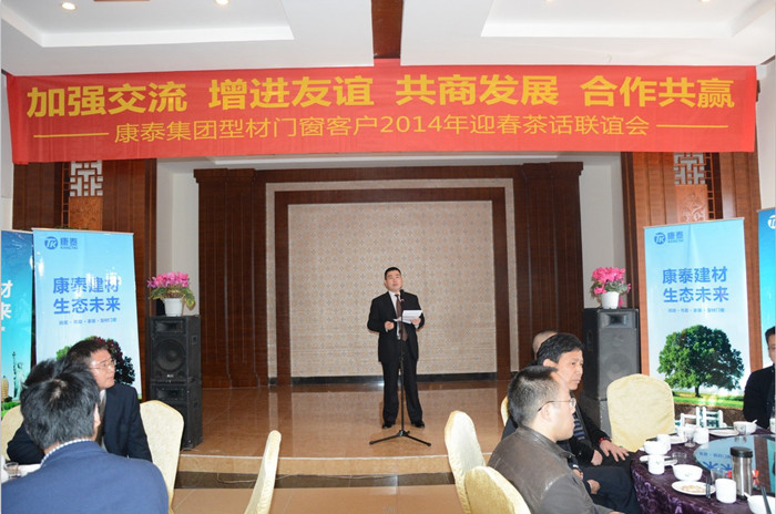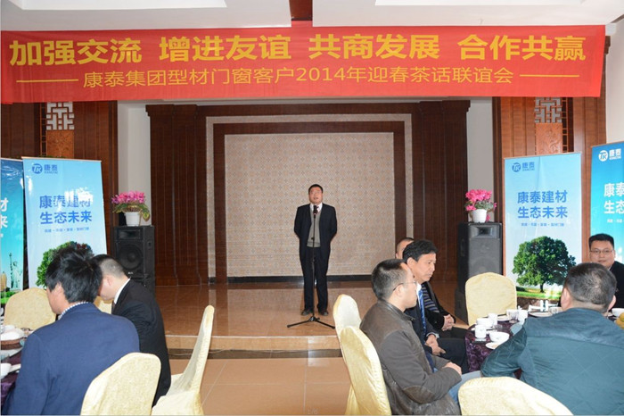 ??? 當(dāng)日,以“加強(qiáng)交流、增進(jìn)友誼、共商發(fā)展、合作共贏”康泰集團(tuán)型材門窗客戶2014年迎春茶話聯(lián)誼會(huì)在美麗的街子古鎮(zhèn)味江味花園飯店隆重召開(kāi),一百多名客戶參加了此次聯(lián)誼會(huì),集團(tuán)公司林總裁、品牌總監(jiān)鄭光鏵、型材事業(yè)部總經(jīng)理陳彪出席本次聯(lián)誼會(huì)。