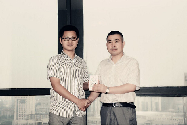 鄭總向最終勝出對(duì)聯(lián)得主渠芳慧先生頒發(fā)征聯(lián)活動(dòng)一等獎(jiǎng)蘋果5S一臺(tái)